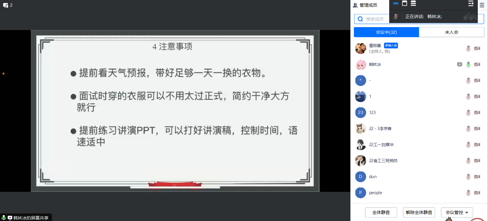 韩林冰简要地概述了初试和复试的流程,她认为,面试时展现良好心理素质是成功的关键。她建议同学们优先确定自己的目标,根据专业课特点,制定合理有效的培养方案。