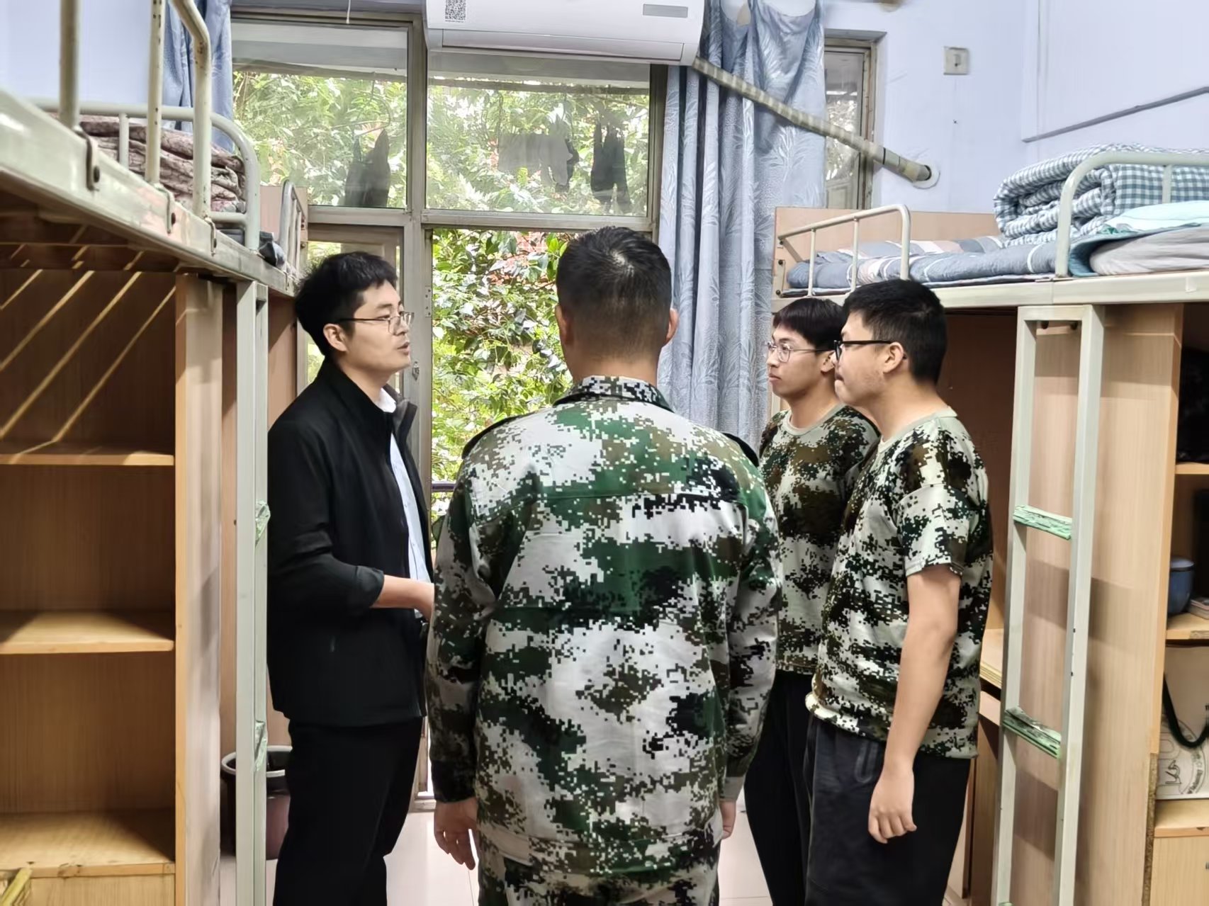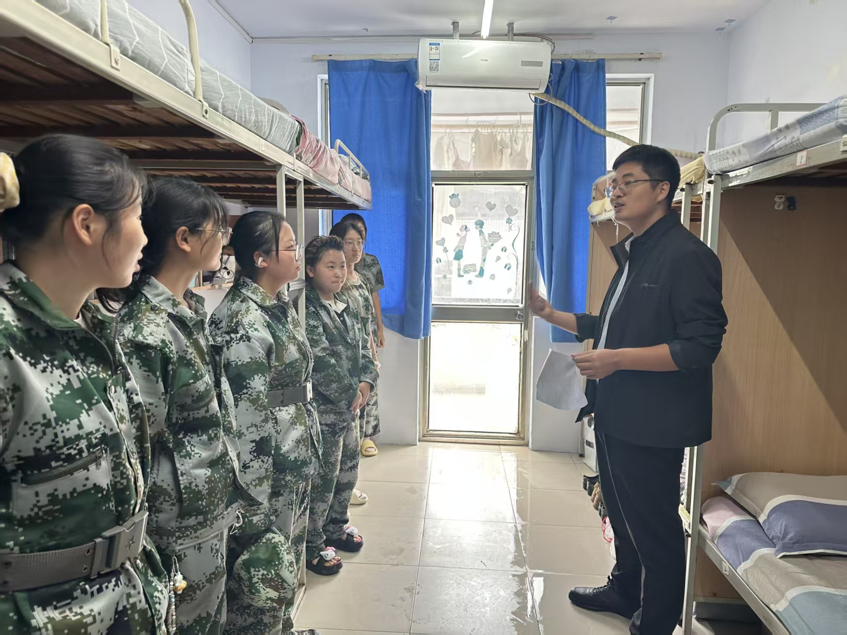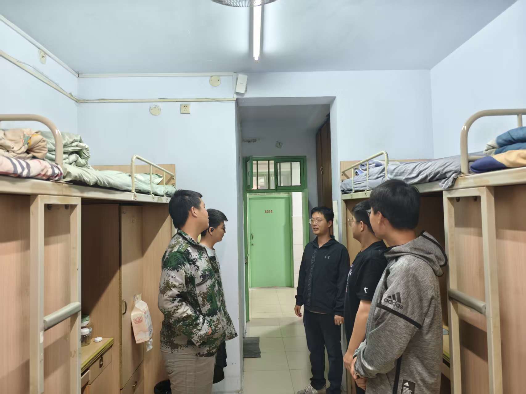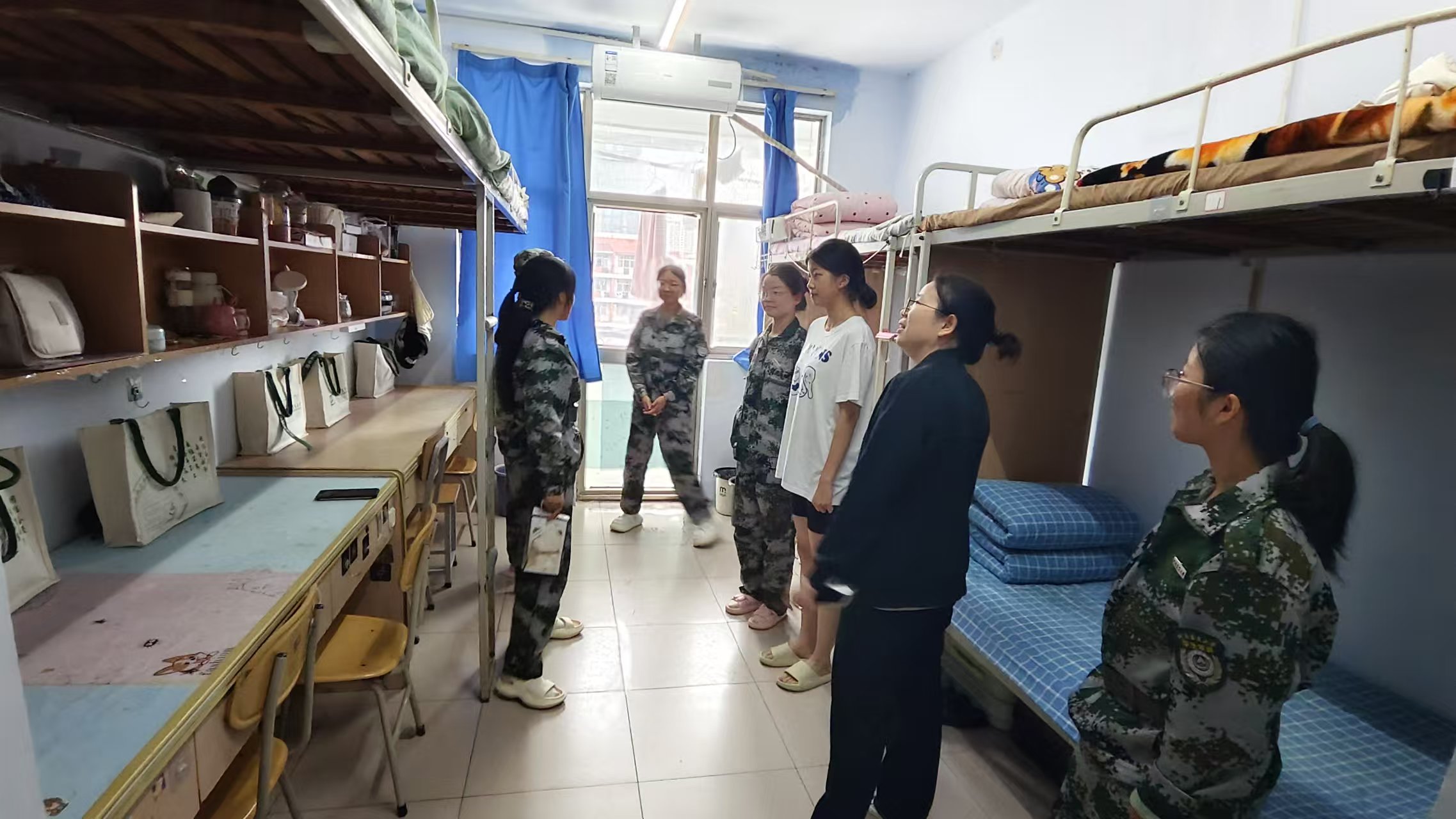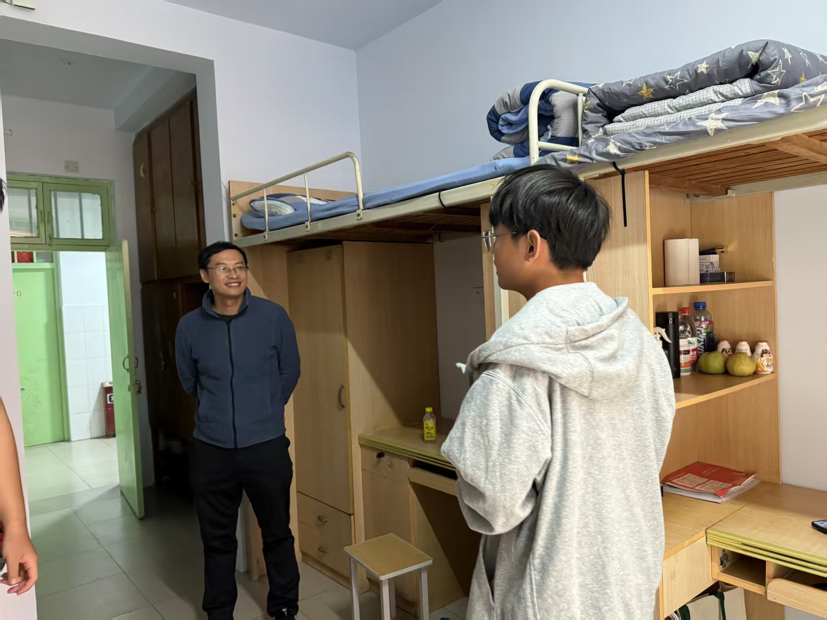 走访过程中,班主任们以“整洁、规范、安全”为标准,逐间查看宿舍内务情况。从床铺被褥的平整叠放、桌面物品的摆放有序,再到宿舍电器安全使用,电线线路排布清晰,老师们细心询问,逐一检查,对于内务整洁、氛围温馨的宿舍,也及时给予肯定与表扬。此外,各班主任还贴心地询问了同学们是否适应住宿生活,学校饭菜价格质量能否接受,一句句亲切的询问,让新生们感到在校的温暖。