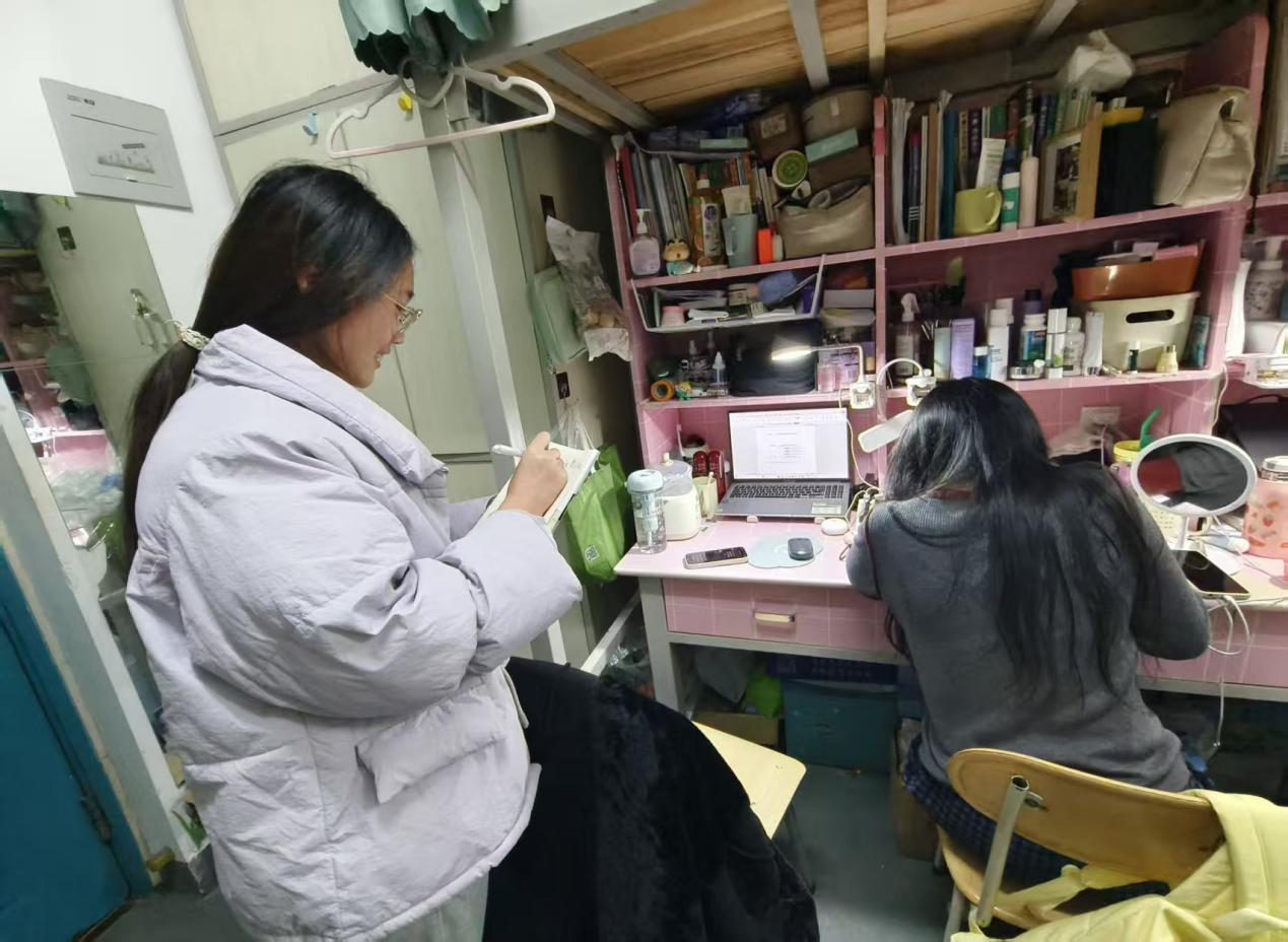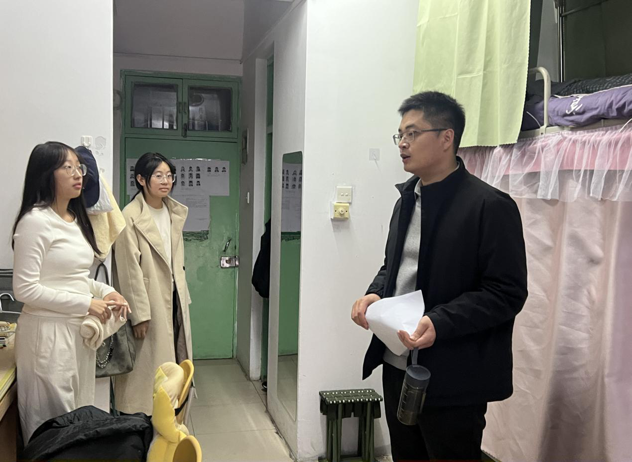 12月9日至12日,院团委书记路平、党委组织员陈翔、团委副书记张金龙、辅导员喻颢如、张泽群、银峰深入各年级宿舍,开展“安全无死角、卫生全覆盖”的双重排查。在排查中,老师们针对上次发现的问题,查看同学们的整改情况,并强调宿舍严禁使用违规大功率电器和食品垃圾要及时清理,引导大家养成整洁、健康的生活习惯。排查期间,老师们格外关注考研学生和四六级考生的备考状态与生活需求,详细询问复习进度、冬季供暖适配情况,叮嘱大家合理安排作息、劳逸结合;对于全体同学期末备考,老师们给出针对性建议,提醒大家要制定科学复习计划,同时着重强调要诚信考试,引导大家树立诚信应考意识,守住学业底线。此外,老师们还主动倾听同学们备考期间的心理压力与生活困难,耐心开展考前心理疏导,缓解焦虑情绪,让严格排查与暖心关怀同步传递,助力同学们轻装上阵迎战考试。