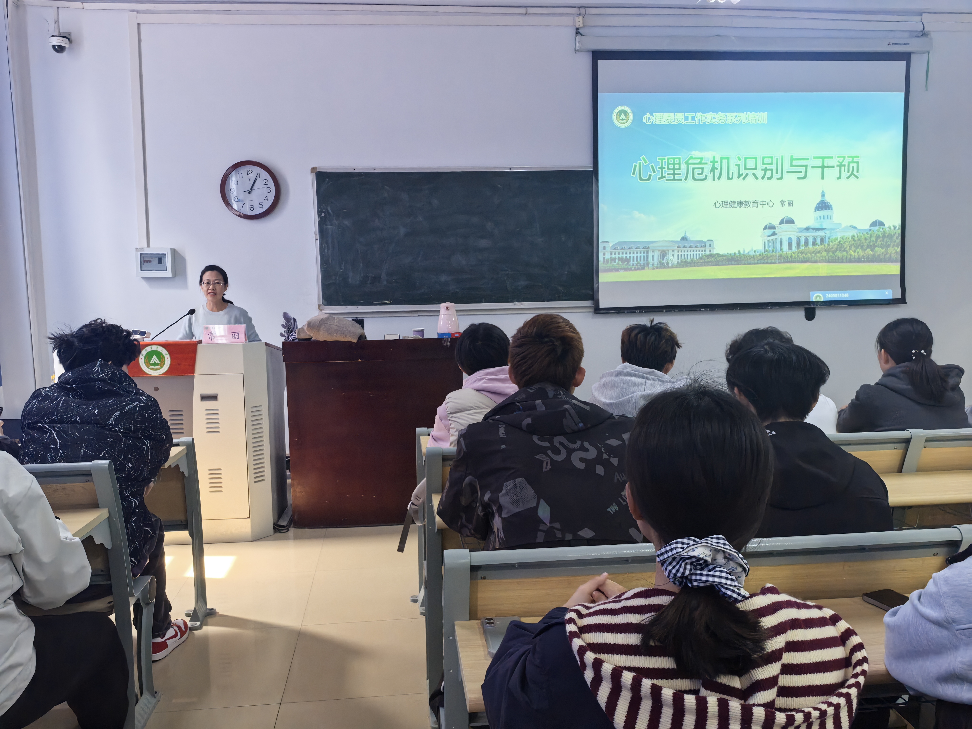 常丽老师以课堂讨论引入,引导大家分享应对同学情绪、行为异常的经历,随后围绕“心理危机”核心概念,讲解构成危机的三要素,纠正“自杀无先兆”“优秀学生不会自杀”等五种常见认知误区,重点解读言语、行为、情绪三类自杀危机预警信号。她还从沟通原则、核心提问、倾听回应等方面,传授与危机风险同学的有效沟通方法,并详细讲解危机上报流程与自我防护要点,为心理骨干开展班级心理帮扶工作提供了专业支撑。