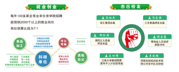 专业建设成果:食品科学与工程专业主干学科分为食品科学与工程、化学、生物学3类,包含10门课程,8门环节。食品科学与工程专业教师承担国家“十二五”“十三五”“十四五”重点研发计划项目、国家自然科学基金、河南省重大科技专项等国家级与省级科研与教研项目40余项,通过省级评价成果20余项,获河南省科技进步二等奖2项、三等奖2项,获批国家专利30余项,发表论文600余篇,其中SCI、EI收录100余篇。